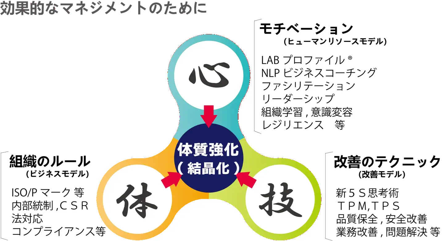 ナレッジリーンでは、心・技・体の三つのモデルを軸に、