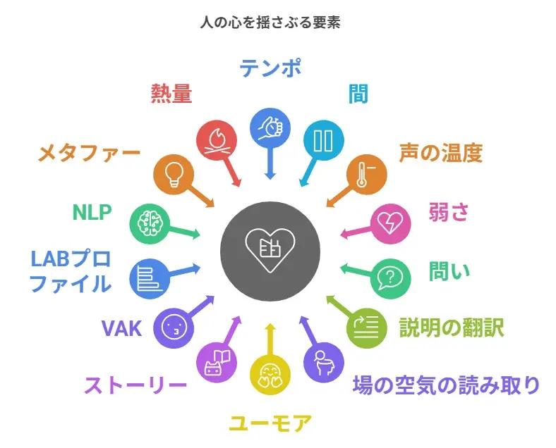 テンポ、声、間、弱さの見せ方、ストーリー、言語パターン、そして空気のつくり方——