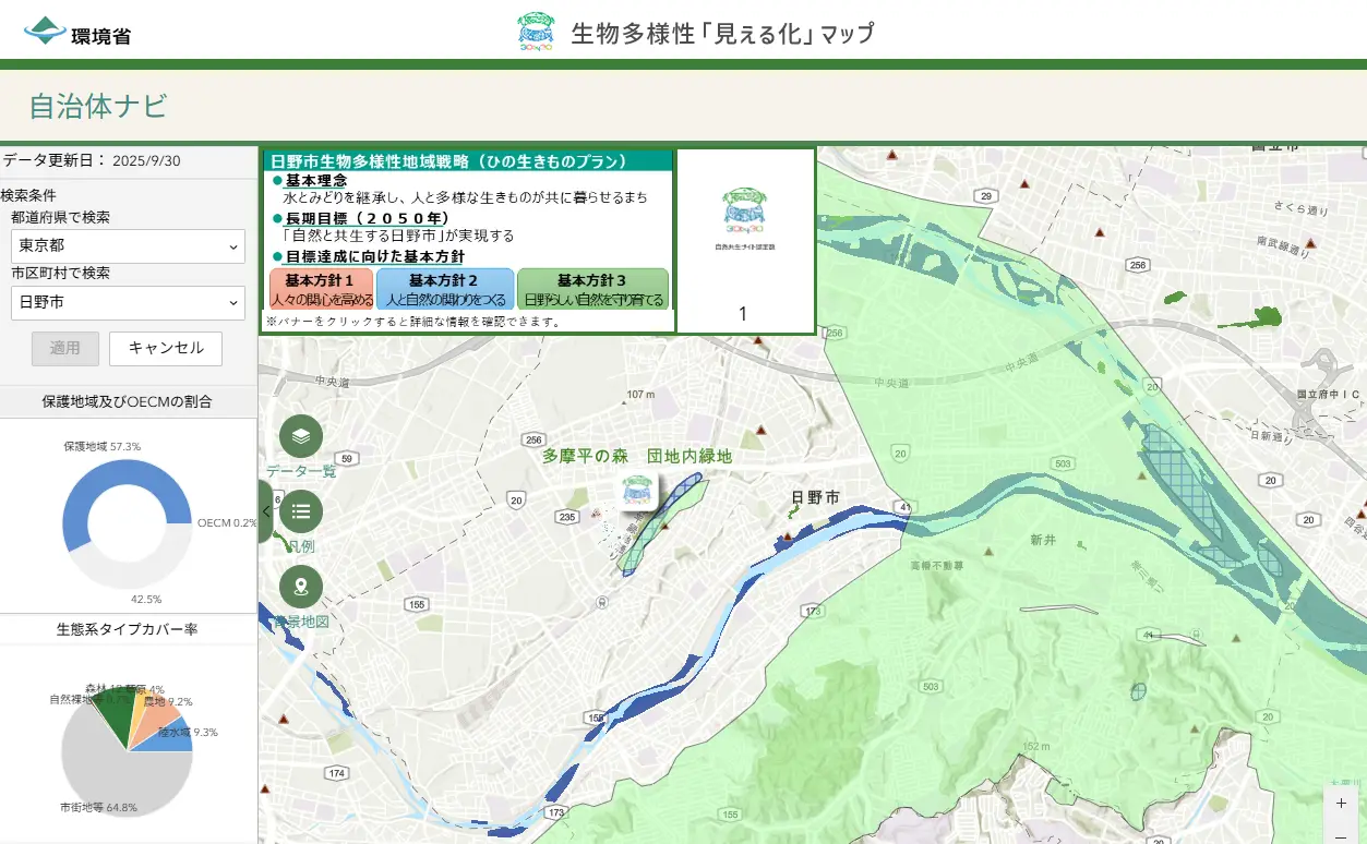 9/30、環境省の「生物多様性見える化システム」の機能拡充が行われ、「自然共生サイトみんなの取組」や「自治体ナビ」が追加されて、地域の保全状況の確認がしやすくなりました。